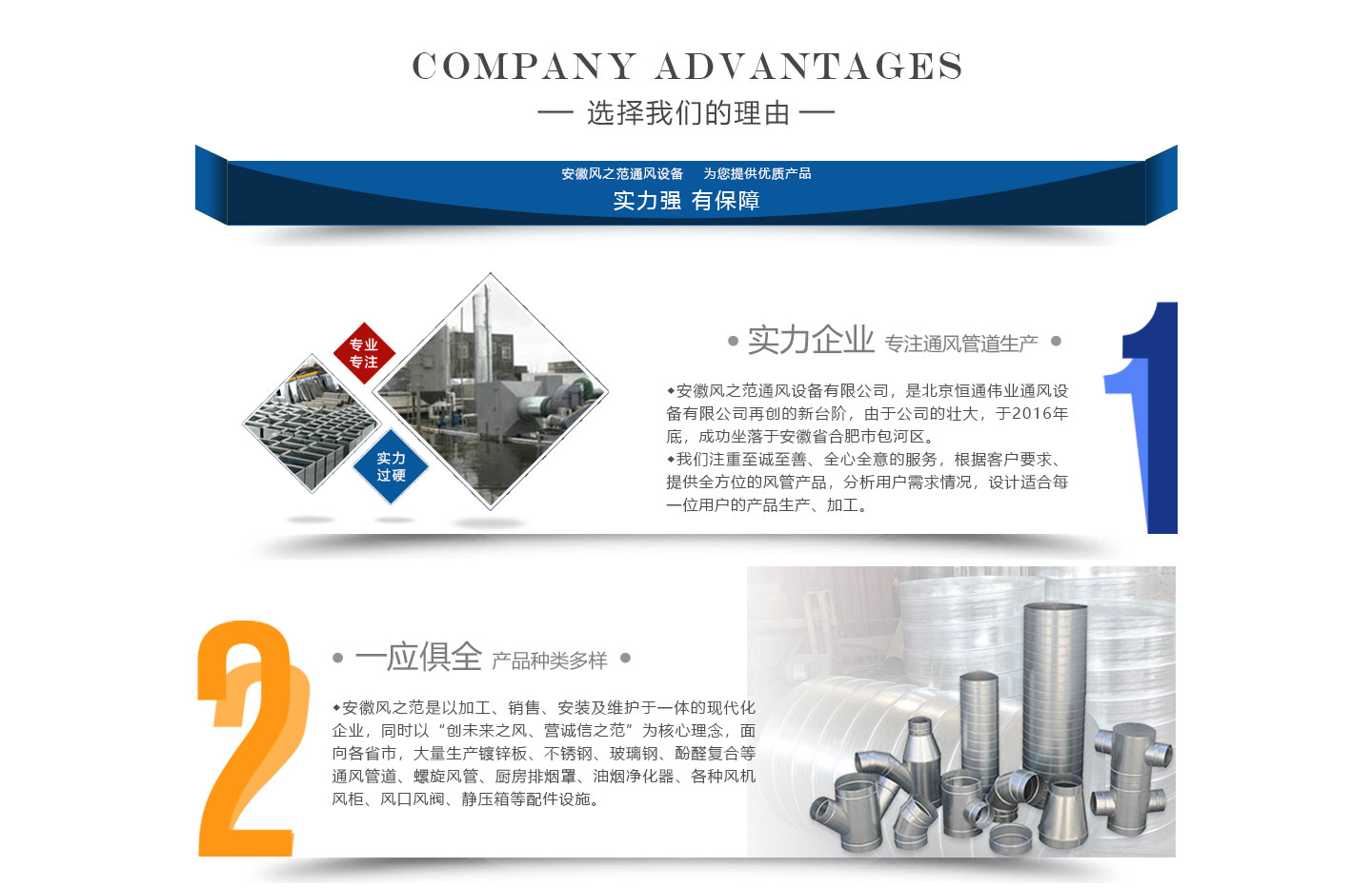 安徽風之范通風設備有限公司,是北京恒通偉業通風設備有限公司再創(chuàng)的新臺階,多年來,公司員工憑著“誠信敬業、團結拼搏、勇于開拓、務實進取”的企業精神,先后承接了多項重點工程項目,使公司健康穩(wěn)步發(fā)展。現由于公司的壯大,業務的拓展,又于2016年底,成功坐落于安徽省合肥市包河區。本公司生產設備精良,技術力量雄厚,質保體系完善!讓用戶體驗到,貼心的服務,無憂的售后!風之范是以加工、銷售、安裝及維護于一體的現代化企業,同時以“創(chuàng)未來之風、營誠信之范”為核心理念,面向全國各省市,大量生產鍍鋅板、不銹鋼、玻璃鋼、酚醛復合等通風管道、螺旋風管、廚房排煙罩、油煙凈化器、各種風機風柜、風口風閥、靜壓箱等配件設施。廣泛承接商場、工廠、酒店、寫字樓、地下室等,消防排煙工程、除塵凈化工程、室內通風工程、暖通空調工程、廚房排煙凈化工程。我們力求上進,追求,歡迎各界人士技術指導,經濟合作,共創(chuàng)美好明天!